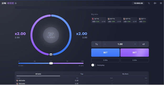 10K Dice is an instant win game by Mascot Gaming, where you stand a chance to win up to 9,500x your stake. The game’s volatility is high, so gameplay is extra exciting.