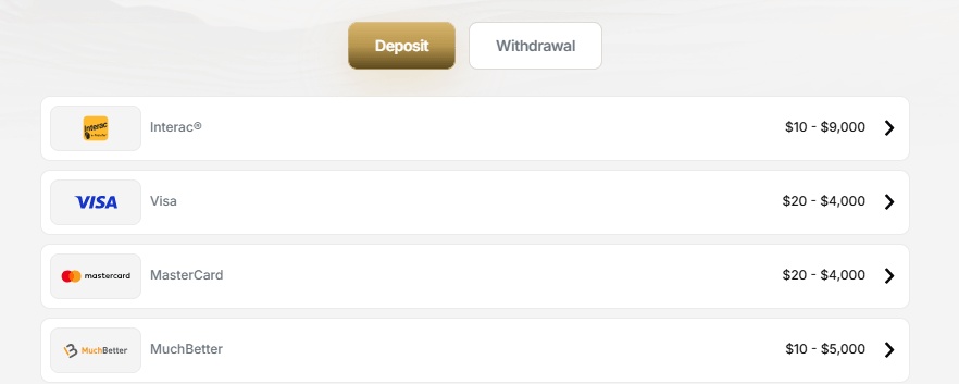 New players start with nine payment methods, with Interac next to a host of crypto choices. They're all withdrawal-ready from the off, though, while you can unlock cards, e-wallets, and prepaid choices as you play.