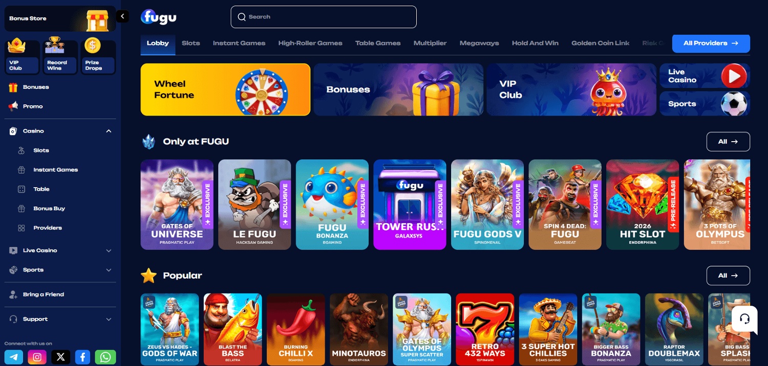This very big site is part of the same Galaktika N.V. operator group as Gizbo Casino and carries a licence from the Curaçao Gaming Authority (CGA). Fugu plays host to 9,000+ games from more than 65 software providers.