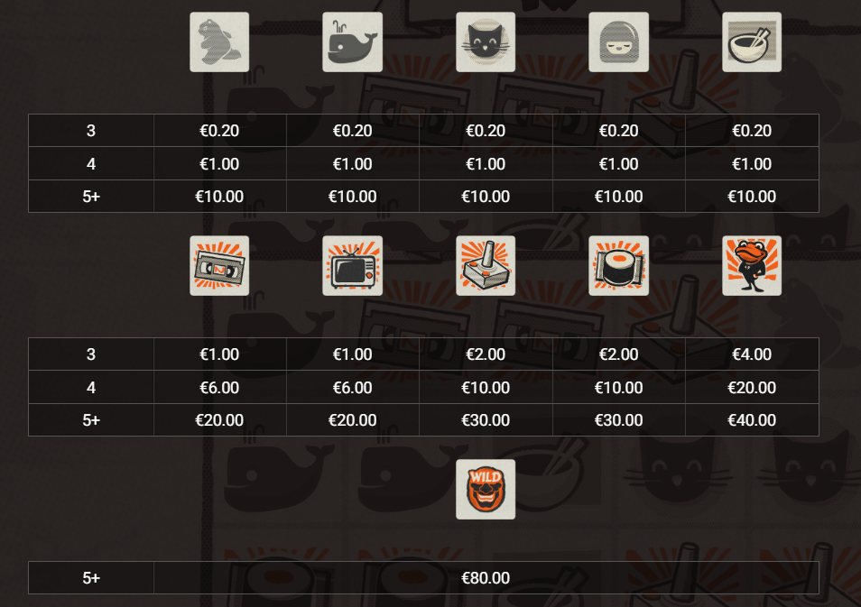 Among the symbols, players will find neatly designed sushi rolls, running bears, whales, and televisions. A smiling frog stands out with vivid orange rays surrounding him and an enigmatic smile.