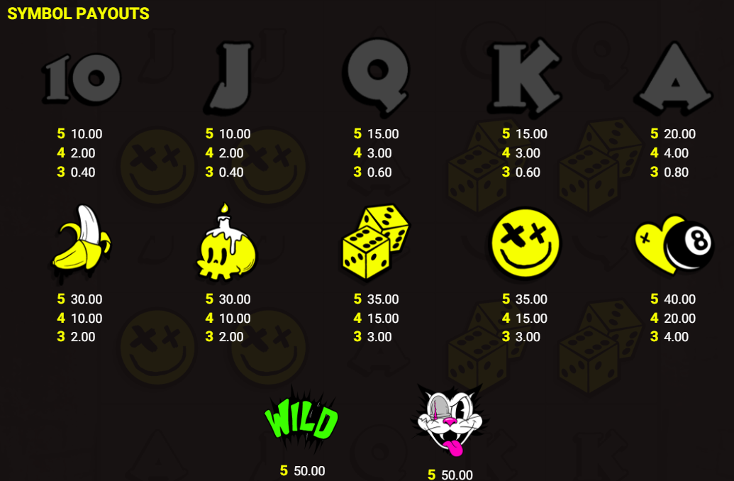 Among the symbols, players will find skulls, bananas, and dice, giving an eclectic feel to the reels. Smiley faces with crossed out eyes add to the grisly atmosphere.