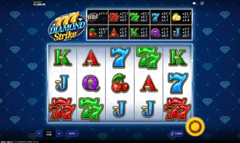 777 Diamond Strike je slot mašina od Red Tiger Gaming. Prema broju igrača koji je traže, 777 Diamond Strike nije veoma popularan slot. Ipak to ne znači da je igra loša, te ne bi bilo na odmet da je probate ili tražite popularne kazino igre