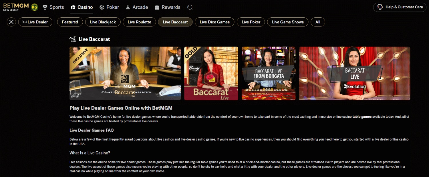 Large selection of live baccarat tables – BetMGM offers a wider range of live baccarat options than many competitors, including BetMGM Baccarat Live, Evolution's Baccarat Live, and tables streamed directly from Borgata.