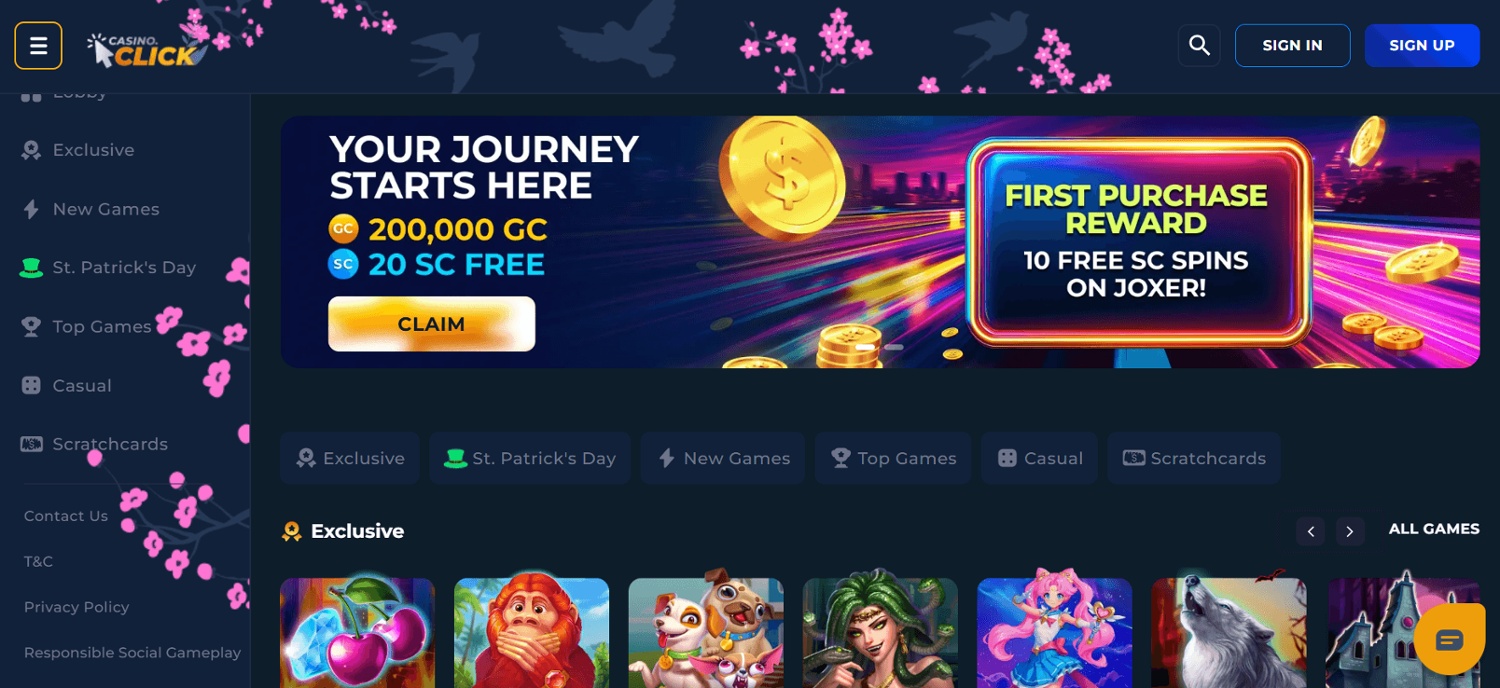 For sweepstakes players, Casino.Click hosts over 1,100 games, slots, crash games, live dealers, scratch cards, and additional options, all of which are available in Gold and Sweeps Coin mode.