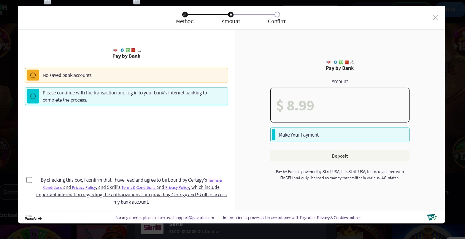 I confirm the payment and wait for the purchase - Deposits or purchases are typically processed instantly via bank transfer. The speed will depend on which bank and casino site you use. Sometimes I am required to verify at this step, depending on the gaming site, and I complete the process immediately to proceed to payment.