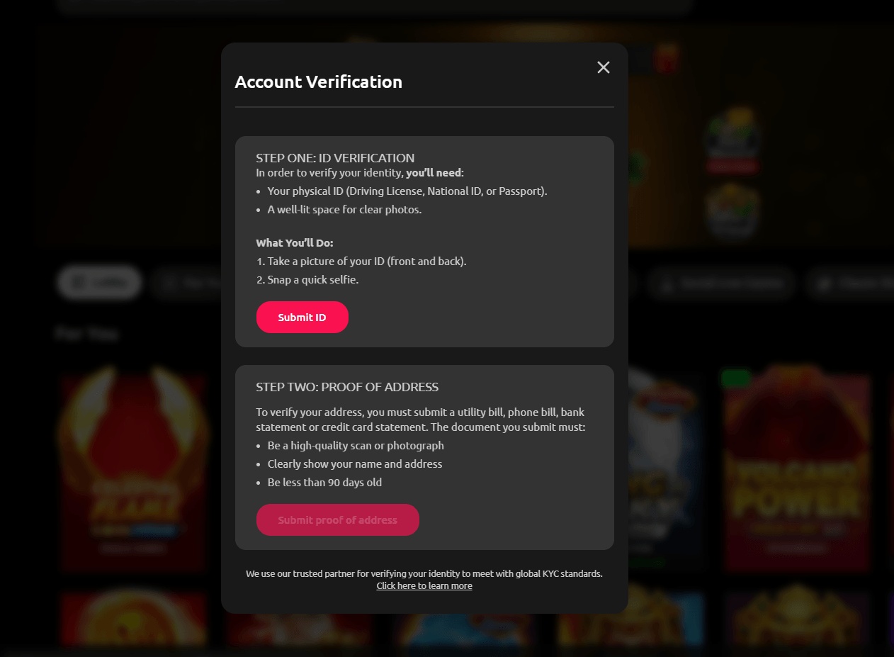 I verify my account - Most casinos will require you to verify your account before you can redeem SC prizes or withdraw wins. I look for the verification section, visit the Cashier (for real money), or use the Redeem tab (for sweepstakes) to start the verification process. Typically, I add a copy of my government ID and proof of address.