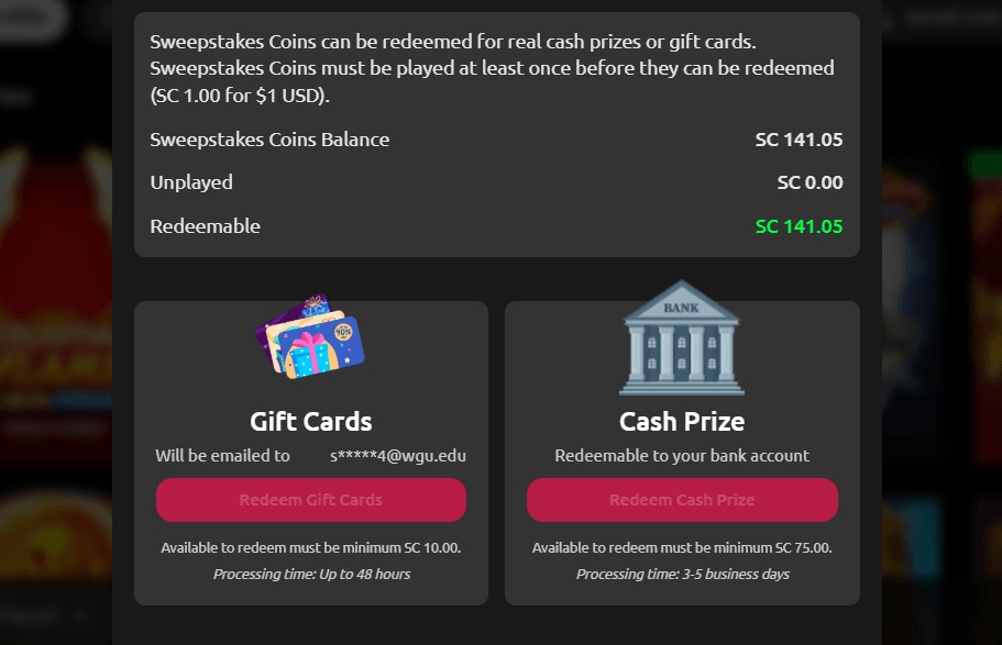 I select Withdraw/Redeem to start the process - I open the Redeem section of my sweepstakes account or visit the cashier to start the redemption process. Real-money sites typically offer redemption amounts of $20-$50 on average. At sweepstakes sites, the minimum for bank transfer is generally 100 SCs.