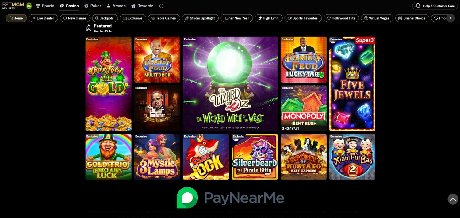 BetMGM offers a welcome bonus that includes a no-deposit bonus and a matched deposit, typically up to $1,000, with a very low playthrough. It also has the famous MGM Rewards system for loyal players and one of the largest game libraries in the country, with over 5,000 games in New Jersey and more than 4,000 in Michigan. So, you can see why it tops the online casinos that accept PayNearMe cards for us.