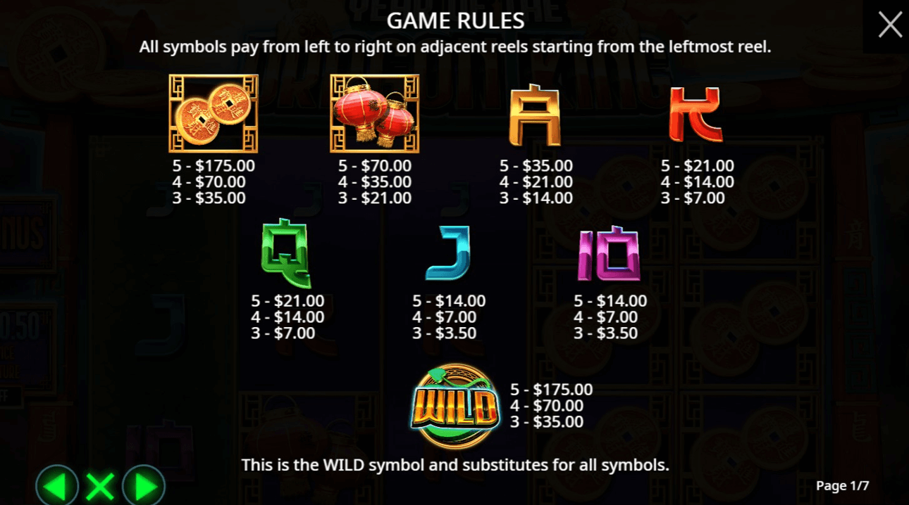 The symbols are those that you would typically associate with the theme. This includes Chinese lanterns, the titular Dragon King, and some gong symbols. A fairly generic oriental-inspired tune plays in the background.